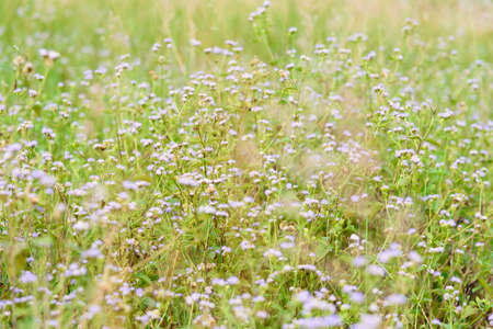 Meadow flowers and grasses illuminated by the warm sun on a summer field, an abstract bright natural background for your design.