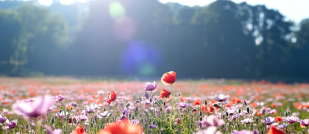 Summer field of red blooming poppies. Countryside landscape with wild vivid flowers, copy space