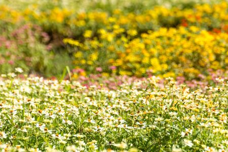 Close up Natural flowers background. Amazing view of colorful flowering in the garden and green grass landscape Overhead view with copy space and template floral background.