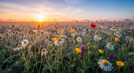 A vibrant field of colorful blooming flowers in pink, yellow, and white is bathed in the soft light of a sunrise.