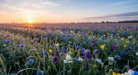 Sunset or sunrise over a field with cornflowers and wildflowers