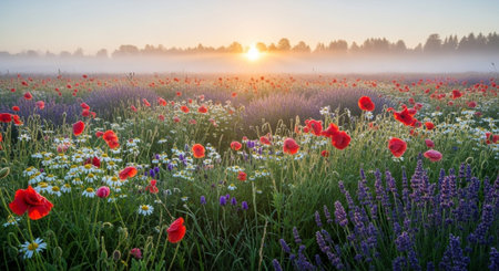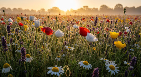 Sunlit meadow with vibrant wildflowers at sunset. Peaceful, idyllic scene.
