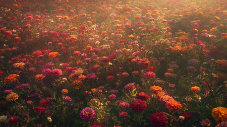 A lush field of colorful wildflowers in full bloom under soft sunlight.