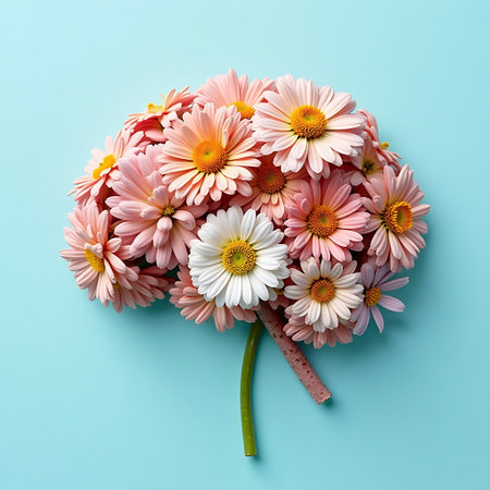A cluster of soft pink and white daisies artfully arranged to resemble a brain, creating a calming and peaceful visual. The pastel colors and delicate petals evoke a sense of tranquility.
