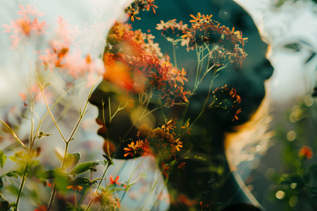 Artistic portrait of a woman with flowers representing femininity, beauty, and nature, showcasing vibrant colors and emotional depth