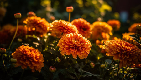 AI Generated. A bunch of orange and yellow flowers are arranged in a row
