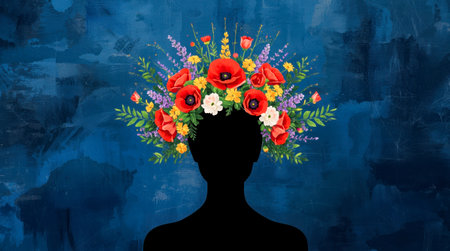 Silhouette of a woman with afro made of red poppies, daisies, and leaves, styled on a textured blue background, symbolizing creativity and nature