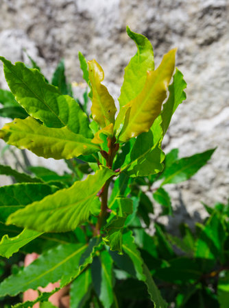 Green Fresh Laurel Bush Leaves against the backdrop of a stone wall