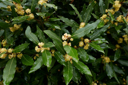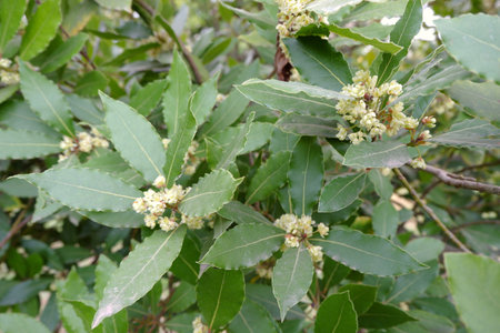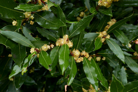 Bay laurel (Laurus nobilis) plants with springtime white flowers and dark green leaves