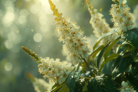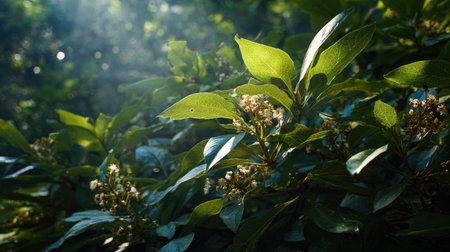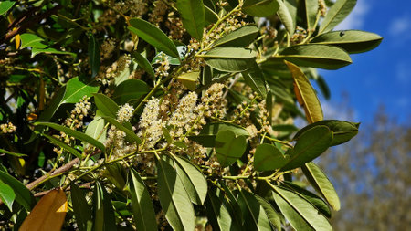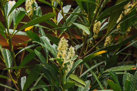Green laurel leaves with small, white flowers are seen in a garden. The sunny afternoon light illuminates the plants, showcasing their vibrant colors and textures in spring.