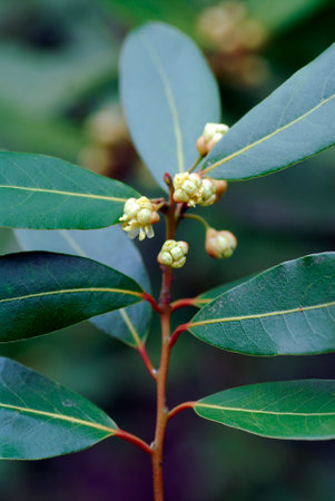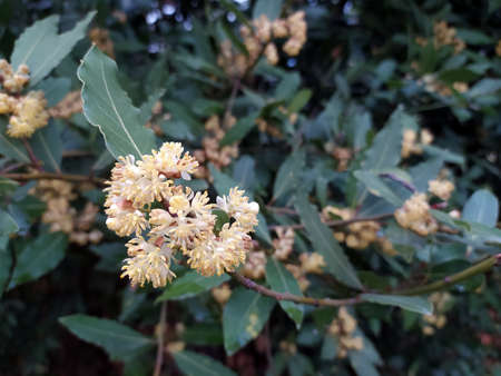 Green leaves and flowers of the laurel (Laurus nobilis)