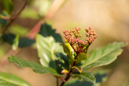 Detail of a bush branch. It has unopened flower buds and they are grouped together. Selective focus.