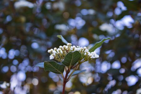Blooming skimmia japonica close up as beautiful natural background