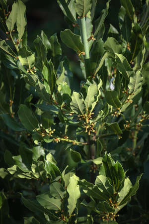 Bay laurel, Laurus nobilis, evergreen tree with green glossy leaves