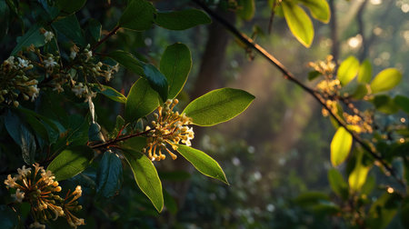 Close up of osmanthus flowers and green leaves