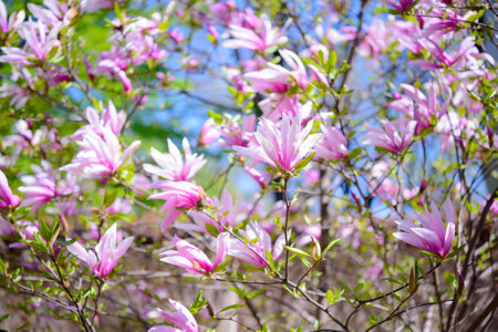 Magnolia soulangeana also called saucer magnolia flowering springtime tree with beautiful pink white flowers March.