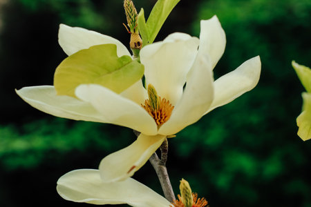 Beautiful blooming magnolia branches with open flowers. White chinese magnolia with tulip flowers in spring garden. Botanical Garden in May.