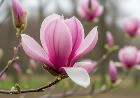 Elegant Pink Magnolia Blossoms in Soft Light of Springtime