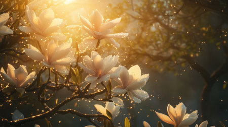 Magnolia tree covered in large white flowers, each with small drops of water that reflect the morning sun. generative ai