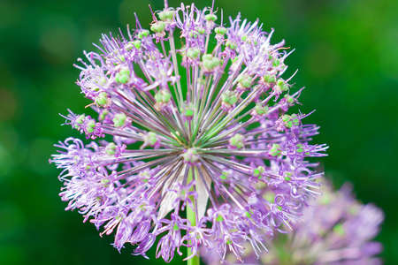 Blooming ornamental onion close-up outdoors, blurred background