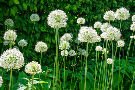 Closeup of white allium flowers blossom in a public garden