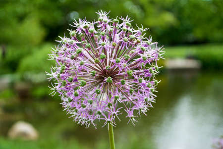 Purple allium lucy ball flowers next to a lake selective focus close up detail