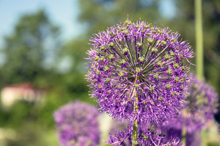 Close up of purple onion flowers blooming in the garden, selective focus