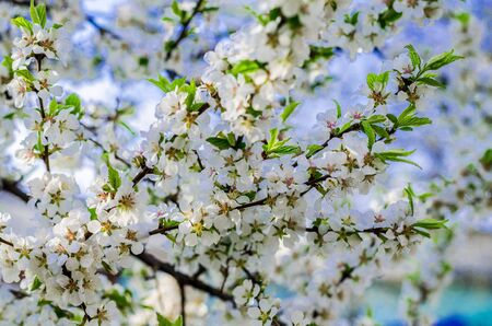 Wild cherry flowers blooming in spring. Wild cherry blossoms with white flowers against a blue sky. Delicate flowers of wild cherry