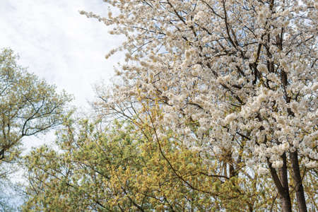 The cherry tree blooms in spring. Fresh blooming flowers are blooming. Spring background of nature.