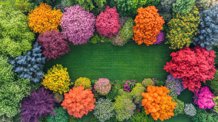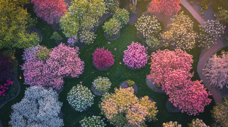 A stunning aerial view of a spring garden showcases an array of flowering trees and vibrant shrubs.