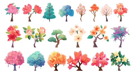 This image showcases a striking collection of vibrant floral and tree in a wide range of colors and styles The composition features a diverse array of blooming flowers lush foliage and abstract tree