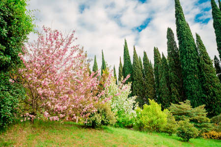 Beautiful spring garden with blooming tulips and cherry blossoms