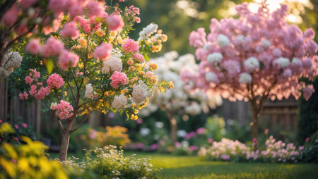 Blossoming garden filled with vibrant pink and white flowers during golden hour