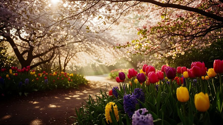 Blooming flowers create a picturesque garden landscape during a sunny afternoon in springtime