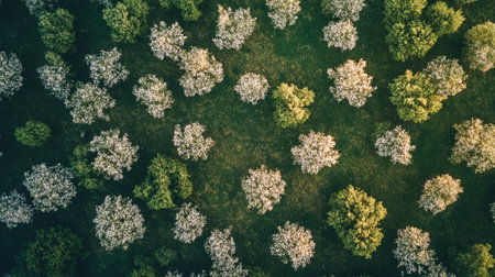 Aerial view of beautiful blooming trees in spring garden. Nature background