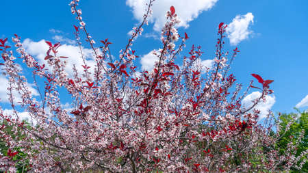 Background of the branches of the blossoming ornamental plum trees with flowers and young leaves