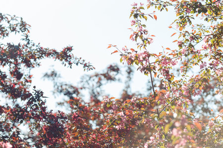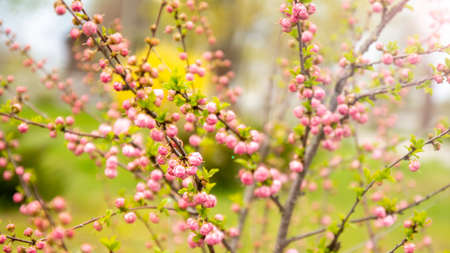 The sun's rays pass through a flowering sakura branch. Pink flowers. Blooming cherry tree. Spring flowering.