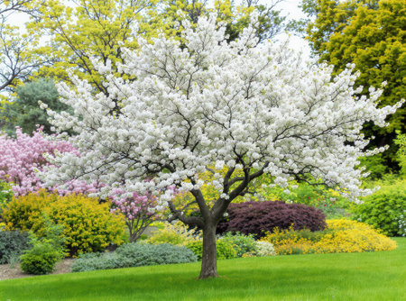 A picturesque garden scene unfolds with a central tree adorned with abundant white blossoms, signifying the arrival of spring. The tree stands gracefully on a carpet of verdant green grass. Surrounding the flowering tree are various types of shrubs and plants, displaying a rich palette of colors including vibrant greens, sunny yellows, and deep purples, with hints of pink flowers. The background features more leafy trees under a bright sky, completing a tranquil and fresh natural landscape. This inviting setting evokes feelings of renewal, beauty, and the rejuvenating essence of the spring season, perfect for themes of nature, growth, and outdoor serenity.