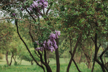 Photo of closeup blossoming tree in forest or park. Beautiful nature background