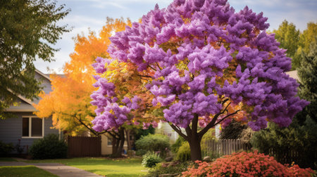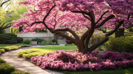 A stunning pink flowering tree stands gracefully in a vibrant garden, surrounded by lush greenery under gentle sunlight, creating a serene and tranquil atmosphere.