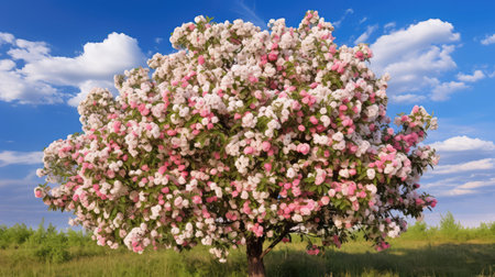 Beautiful blooming tree on blue sky background. Spring landscape.