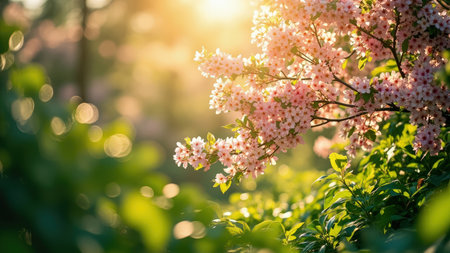 White flowers blooming on a cherry tree branch in an orchard at sunset, creating a beautiful bokeh effect. Ai generated image