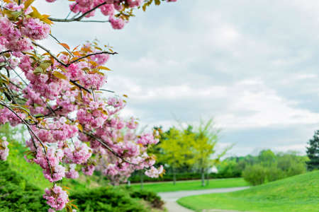 Sakura cherry flower blossom in spring. Spring floral branch. Beautiful flowers on a tree branch. Spring Background.