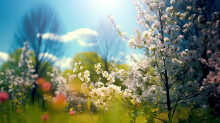 Beautiful blurred spring background nature with blooms white flowers,generated with AI. High-quality photo