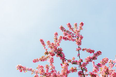 Branches of flowering tree against blue sky on sunny spring day. Plum blossom. Copy space