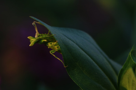 The green camouflage mantis clings to the red vegetation in the forest against a blurred soft background.