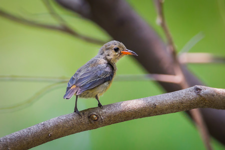 Young Scarlet-backed Flowerpecker(Dicaeum cruentatum) turn to see us in nature in Thailand