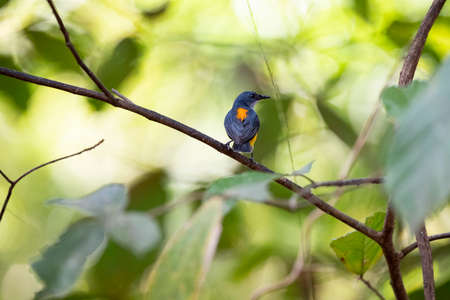 A male orange - bellied flowerpecker is perching on a tree branch turning its back to show triangular orange patch.