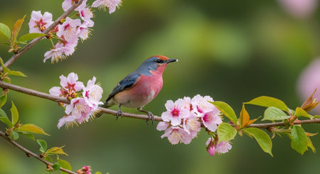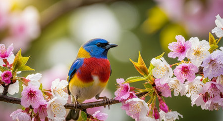 Vibrant painted bunting perched on cherry blossom branch in spring