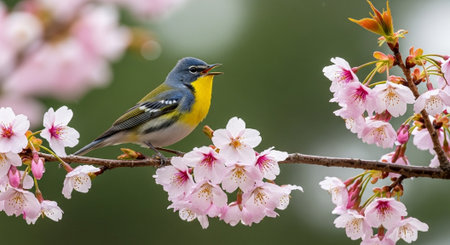 Vibrant blue and yellow bird singing on cherry blossom branch